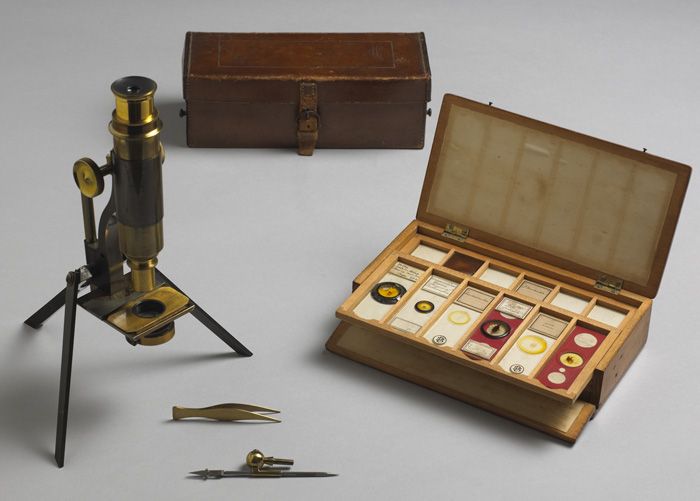 A small brass travelling monocular microscope with integral tripod stand and tweezers, contained in original leather case. Together with a small oak case containing 10 20th Century specimen slides. The slides with the monogram of Sir Philip Brocklehurst who gifted them to Bob Bell, a biologist with The British Antarctic Survey Team during the 1970s. Both items are believed to have been on the Nimrod during the 1907 expedition. Also with The Shackleton Voyages by Roland Huntford, London 2002, 288pp. Shackleton at South Georgia by Robert Burton and Stephen Venables, signed by the latter and a 2011 Aurora Expeditions booklet. (5 items)
