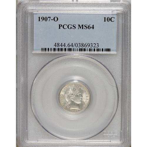 <B>1907-O 10C MS64 PCGS.</B></I> PCGS Population (38/29). NGC Census: (28/31). Mintage: 5,058,000. Numismedia Wsl. Price: $420. (#4844)<BR><BR><b>Shipping:</b> Coins & Currency (<a target="_blank" href="http://www.heritageauctions.com/common/shipping.php">view shipping information</a>)
