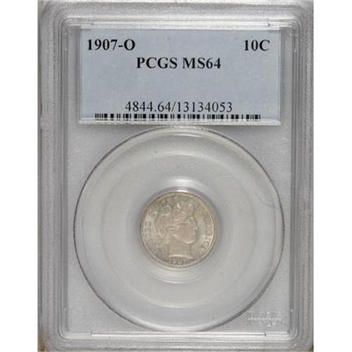 <B>1907-O 10C MS64 PCGS.</B></I> PCGS Population (39/28). NGC Census: (28/31). Mintage: 5,058,000. Numismedia Wsl. Price for NGC/PCGS coin in MS64: $420. (#4844)<BR><BR><b>Shipping:</b> Coins & Currency (<a target="_blank" href="http://www.heritageauctions.com/common/shipping.php">view shipping information</a>)
