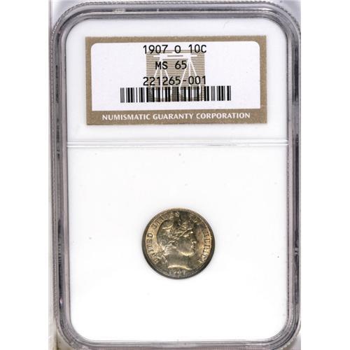 <B>1907-O<10C> MS65 NGC.</B></I> Rich apple-green and lilac toning invigorate this lustrous and suitably struck Gem. The reverse is beautifully preserved, and the obverse is also clean. Census: 17 in 65, 14 finer (6/06).