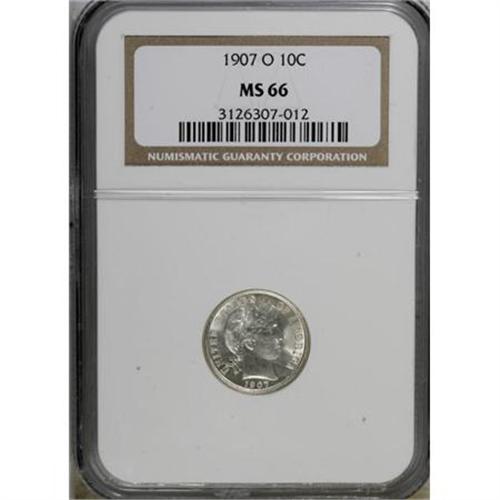 <B>1907-O 10C MS66 NGC.</B></I> A bright satiny sheen encompasses the brilliant, silver-white surfaces. A few of the peripheral letters and wreath leaves are softly struck, as usual for the New Orleans Mint. Surface marks are minimal, as expected for the Premium Gem grade level. Census: 15 in 66, 1 finer (3/08). <BR><BR><B>Coin Engraver:</B> Charles E. Barber<BR><BR><b>Shipping:</b> Coins & Currency (<a target="_blank" href="http://www.heritageauctions.com/common/shipping.php">view shipping information</a>)