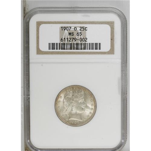 <B>1907-O 25C MS65 NGC.</B></I> Blazing luster radiates from well preserved surfaces that display wisps of tan color about the margins. All of the design elements are well brought up. Census: 15 in 65, 10 finer (11/06).<BR><BR><b>Shipping:</b> Coin/Currency (<a target="_blank" href="http://www.heritageauctions.com/common/shipping.php">view shipping information</a>)