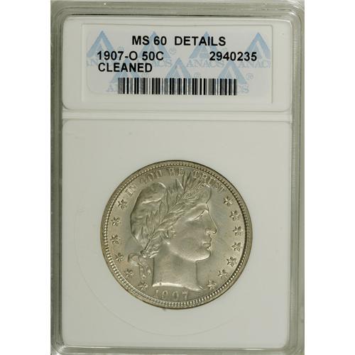 <B>1907-O 50C --Cleaned--ANACS. MS60 Details.</B></I> NGC Census: (0/140). PCGS Population (0/0). Mintage: 3,946,600. Numismedia Wsl. Price for NGC/PCGS coin in MS60: $408. (#6510)<BR><BR><b>Shipping:</b> Coins & Currency (<a target="_blank" href="http://www.heritageauctions.com/common/shipping.php">view shipping information</a>)