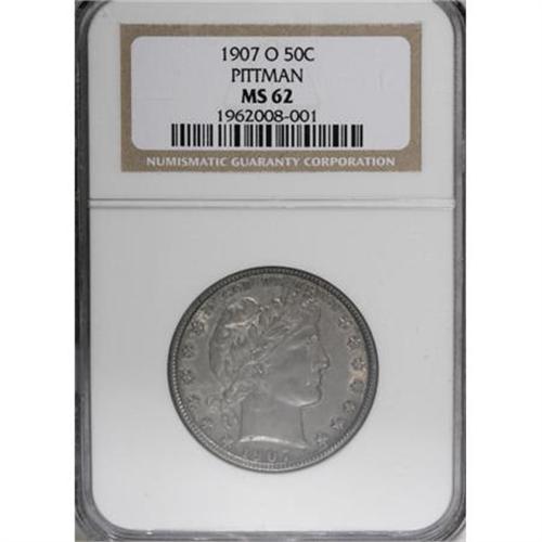 <B>1907-O 50C MS62 NGC.</B></I> Ex: Pittman. Deep dove-gray and autumn-brown blankets this well struck example. Luster fills the borders and devices. In the second Pittman catalog, Akers wrote, "This coin is one step beyond the 'mumps' variety. I will call [it] the 'Elephant Man' variety since there are large lumps on the face and eyebrow as well as the neck."<BR><I>Ex: John Jay Pittman Collection, Part Two (David Akers, 5/98), lot 1615.</B></I><BR><BR><B>Coin Engraver:</B> Charles E. Barber<BR><BR><b>Shipping:</b> Coins & Currency (<a target="_blank" href="http://www.heritageauctions.com/common/shipping.php">view shipping information</a>)