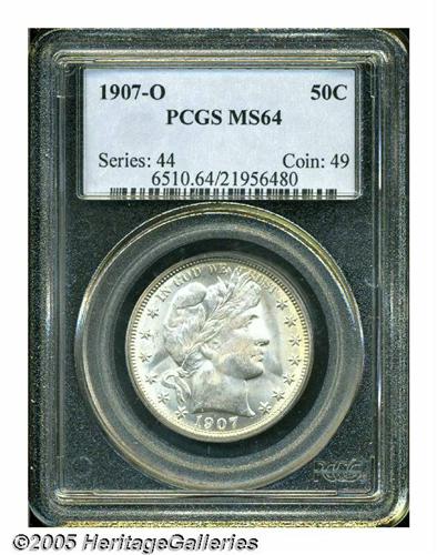 <B>1907-O<50C> MS64 PCGS.</B></I> Well struck with an interesting planchet flaw (as struck) just above Liberty's jaw, very bright satiny luster, hints of pale golden toning near the borders on the otherwise untoned, silver-white surfaces, and minimal abrasions for a near-Gem. Population: 32 in 64, 17 finer (4/05).