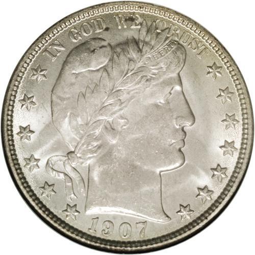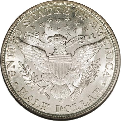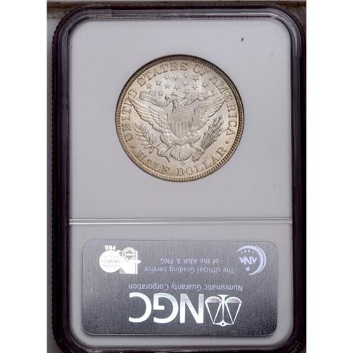 <B>1907-O<50C> MS65 NGC.</B></I> Shimmering full mint frost shines exuberantly from both sides of this visually enticing Gem. Lovely silver-beige toning with light golden color near the borders. Minor die wear is noted on the obverse, and die clash marks are evident in the upper reverse fields. Weakly struck in the centers, as one would normally expect from an O-mint Barber half. Census: 17 in 65, 10 finer (2/06).