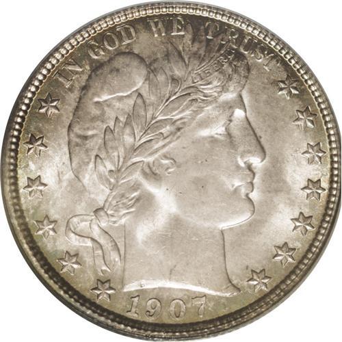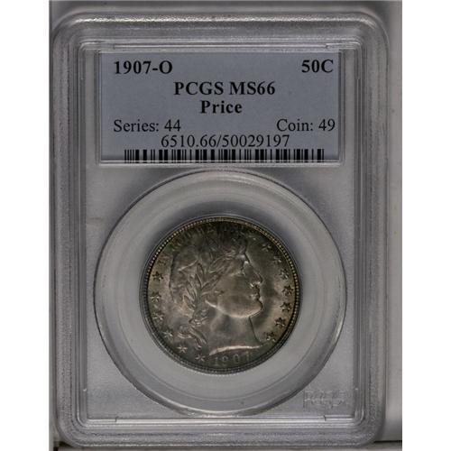 <B>1907-O<50C> MS66 PCGS.</B></I> Ex: Price. Apple-green, dove-gray, and orange shades grace this lustrous and carefully preserved Barber half dollar. The strike is unusually sharp, since the fletchings and shield corners have pleasing detail. Despite a plentiful production, the 1907-O is scarce in Mint State and a significant rarity above the MS65 level. Population: 6 in 66, 1 finer (7/06).<BR><I>Ex: Dr. Thaine B. Price Collection (David Akers, 5/98), lot 172.</B></I>