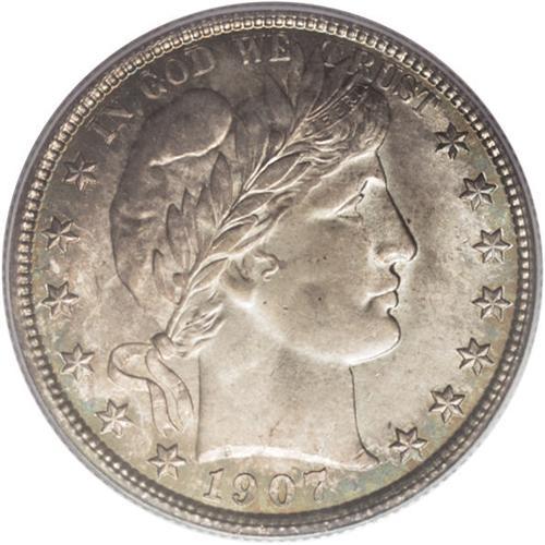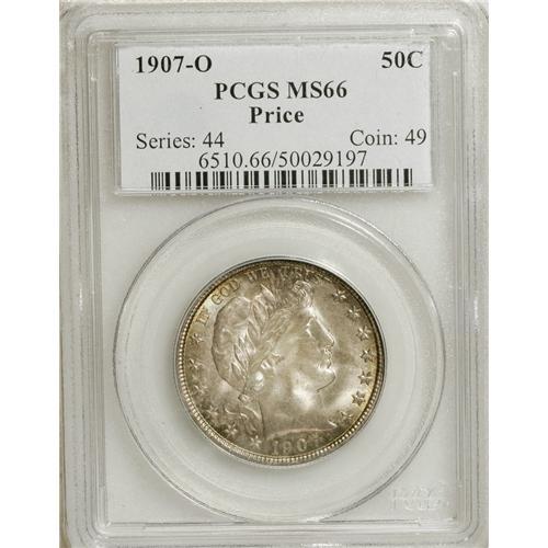 <B>1907-O 50C MS66 PCGS.</B></I> Ex: Price. Apple-green, dove-gray, and orange shades grace this lustrous and carefully preserved Barber half dollar. The strike is unusually sharp, since the fletchings and shield corners have pleasing detail. Despite a plentiful production, the 1907-O is scarce in Mint State and a significant rarity above the MS65 level. Population: 6 in 66, 1 finer (3/07).<BR><BR><b>Shipping:</b> Coins & Currency (<a target="_blank" href="http://www.heritageauctions.com/common/shipping.php">view shipping information</a>)