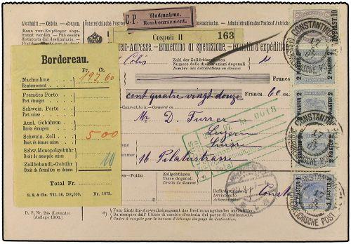 1907 Parcel Card to Geneva franked by 1900 1 pi. on 25 h. ultramarine, 3x2 pi. on 50 h. grey and 10 pi. on 2 kr. grey lilac all tied by Constantinople cds´s (May 17). Rare. Scott 34,35,37.