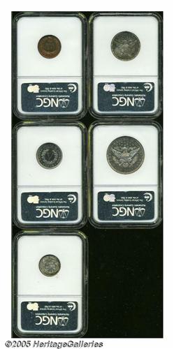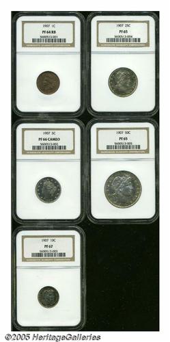 <B>1907 Proof Set PR64 to PR67 NGC.</B></I> The set includes:<BR><B>Cent<1C> PR64 Red and Brown.</B></I> Attractively toned in deep orange-red and ruby colors. A few minute carbon flecks are of no significance. The 1907 has the lowest proof mintage of any date after 1877.<BR><B>Nickel PR66 Cameo.</B></I> Lovely pastel peach and powder-blue colors. The strike is not quite full on the left ear of corn, but is generally crisp. The 1907 has the lowest proof mintage of the series, excluding the extremely rare unauthorized 1913 strikings. Only a few pinprick flecks prevent a finer grade.<BR><B>Dime PR67.</B></I> Beautiful golden-brown and aquamarine colors illuminate the obverse. The reverse has a cream-gray center and peripheral russet toning. An exquisitely struck and pleasing Superb Gem, very scarce in higher grades. Only 575 pieces were struck.<BR><B>Quarter PR65.</B></I> Variegated tan-brown and gunmetal-gray colors ensure the originality and eye appeal of this lovely Gem. Crisply struck and undisturbed. Among the lowest mintage proof issues of the type.<BR><B>Half Dollar PR65.</B></I> Streaks of pale honey-brown color traverse this attractive and boldly struck specimen. The major devices exhibit mild contrast with the reflective fields, although not sufficiently to attain a Cameo designation. Like the Barber Dime and Quarter, the Half Dollar proof production was limited to a mere 575 pieces.
