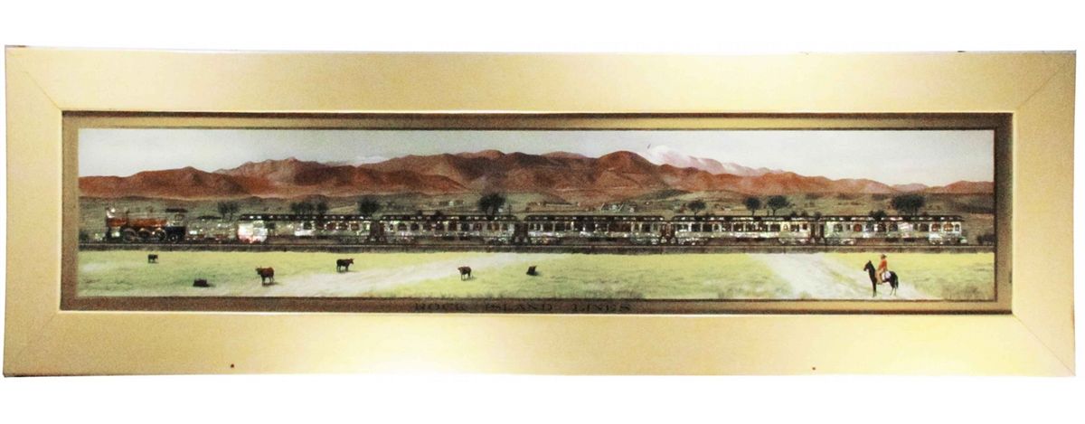 1907 Rock Island Railroad Reverse Glass Sign. The best one we have ever seen as far as the reverse paint goes. It has not been restored, however, the frame has been painted. It could be easily striped and refinished. It has been in a basement in Chicago for the last 25 years. Excellent condition. 89 3/4 X 26 3/4 inches overall.