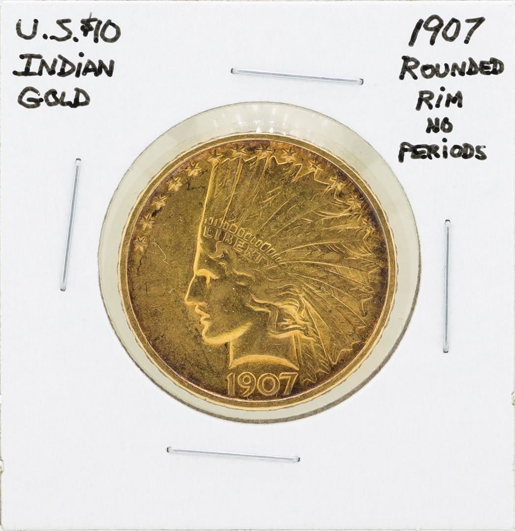 One 1907 Rounded Rim No Periods $10 Indian Head Eagle Gold Coin.