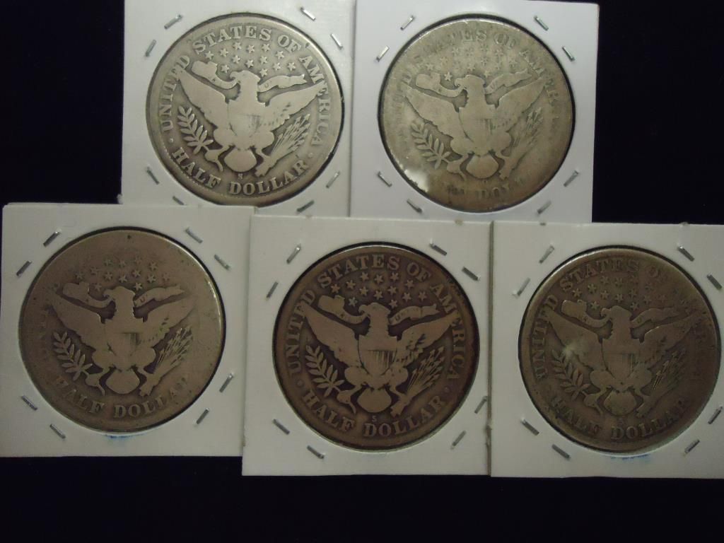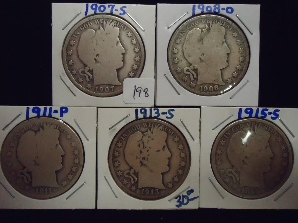 1907-S,08-O,11,13-S & 15-S BARBER HALF DOLLARS