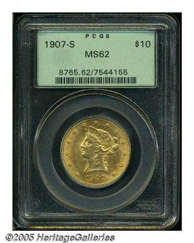 <B>1907-S<$10> MS62 PCGS.</B></I> Not fully struck in the centers, but the sweeping luster does not reveal heavy marks. This lower mintage issue is a noted scarcity in Mint State. Housed in a green label holder. Population: 25 in 62, 19 finer (5/05).
