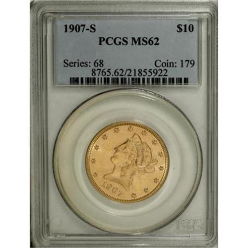 <B>1907-S $10 MS62 PCGS.</B></I> Well struck, lustrous, and clean overall, but limited by marks near the jaw, beneath the bun, and near the arrowheads. A better 20th century piece that is significantly more elusive than its Philadelphia counterpart. Population: 55 in 62, 24 finer (12/07).<BR><BR><B>Coin Engraver:</B> Christian Gobrecht<BR><BR><b>Shipping:</b> Coins & Currency (<a target="_blank" href="http://www.heritageauctions.com/common/shipping.php">view shipping information</a>)