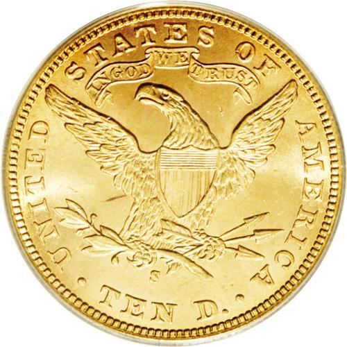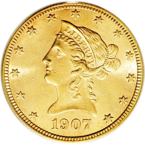 <B>1907-S<$10> MS64 PCGS.</B></I> The final year for the Liberty eagle series which had run for 70 years with basically, the same design. This specimen has a pleasing, rich reddish-golden color and is very well struck. In Choice grades, it is quite elusive as, PCGS has only certified 6 MS64s with just 2 higher (2/06).<BR><I>From The Sandia Mountain Collection.</B></I>