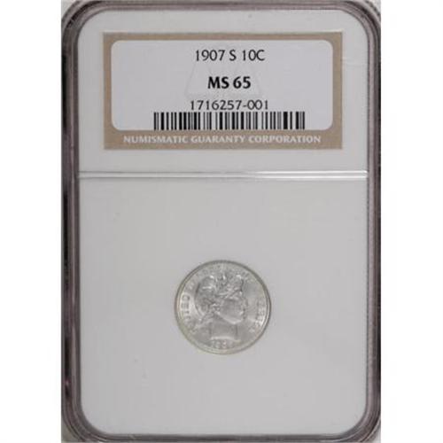 <B>1907-S 10C MS65 NGC.</B></I> Essentially untoned with strong luster and crisp detail. A handful of tiny flaws appear on and near the portrait, but the overall effect is consistent with the Gem designation. Census: 6 in 65, 1 finer (1/08).<BR><I>From The Southwest Collection.</B></I><BR><BR><B>Coin Engraver:</B> Charles E. Barber<BR><BR><b>Shipping:</b> Coins & Currency (<a target="_blank" href="http://www.heritageauctions.com/common/shipping.php">view shipping information</a>)