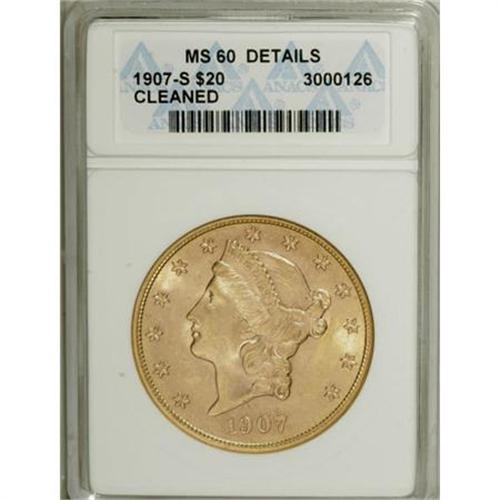 <B>1907-S $20 --Cleaned--ANACS. MS60 Details.</B></I> NGC Census: (132/2306). PCGS Population (153/2082). Mintage: 2,165,800. Numismedia Wsl. Price for NGC/PCGS coin in MS60: $680. (#9054)<BR><BR><B>Coin Engraver:</B> James B. Longacre<BR><BR><b>Shipping:</b> Coins & Currency (<a target="_blank" href="http://www.heritageauctions.com/common/shipping.php">view shipping information</a>)