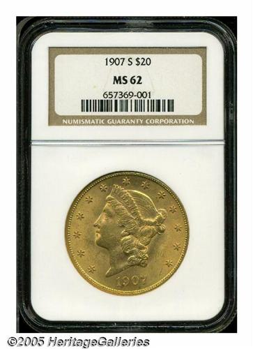 <B>1907-S<$20> MS62 NGC.</B></I> This is an exceptionally attractive example for the grade with bright apricot-gold patina showing faint greenish color at the rims. The lustrous surfaces have a few abrasions typical for the grade, and display well struck design elements.