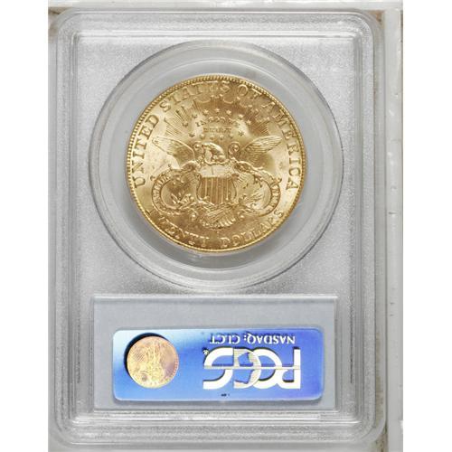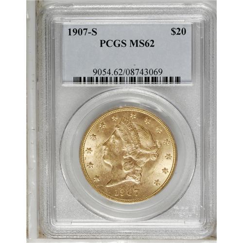<B>1907-S<$20> MS62 PCGS.</B></I> A charming wheat-gold piece with apricot accents. A nicely detailed example whose lustrous surfaces have sustained some significant abrasions.