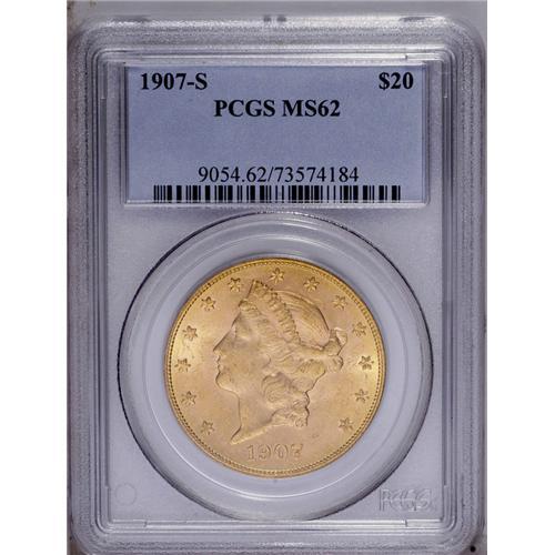 <B>1907-S<$20> MS62 PCGS.</B></I> A satiny and moderately abraded final year gold type coin that shows some striking incompleteness on the highpoints of the hair.