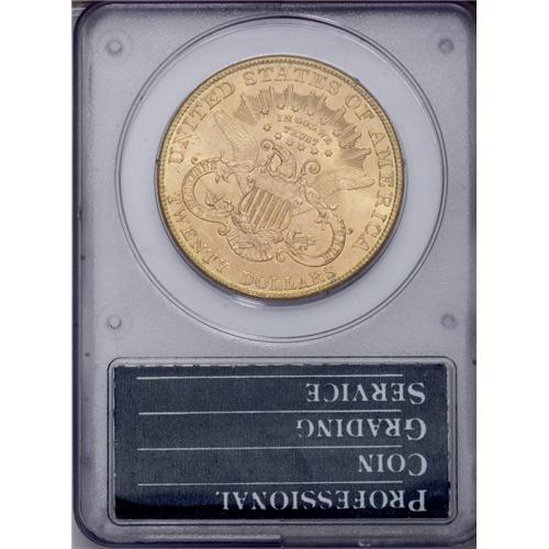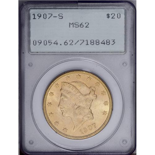 <B>1907-S<$20> MS62 PCGS.</B></I> Nice definition is apparent on the design elements, and the surfaces reveal honey-gold patina with subtle greenish undertones. Scattered minute contact marks, especially on the obverse, occasionally interrupt the luster flow. Housed in a first generation PCGS holder.