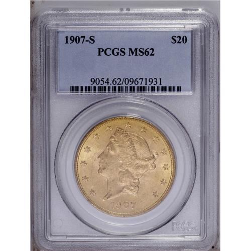 <B>1907-S<$20> MS62 PCGS.</B></I> Straw-gold surfaces display soft luster and sharply struck devices. Numerous scuffs and contact marks are especially noticed on the obverse.