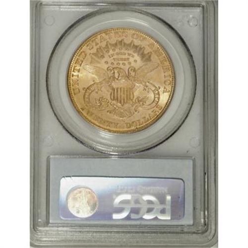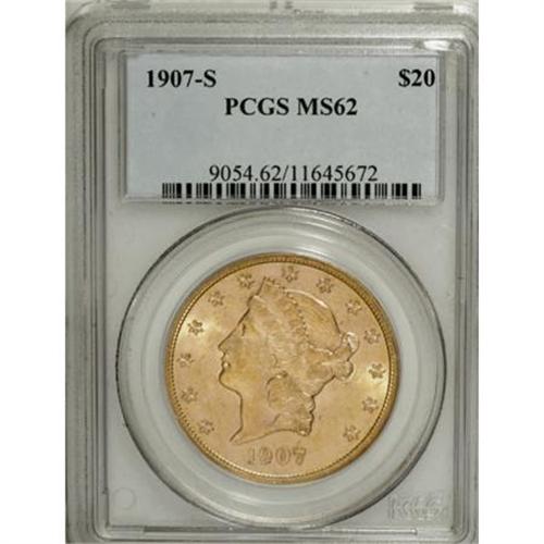 <B>1907-S $20 MS62 PCGS.</B></I> This vibrantly lustrous representative is from the last year of the Liberty Head double eagle design. The pronounced honey-rose coloration is decidedly attractive. An appealing coin for final-year type purposes. <BR><BR><B>Coin Engraver:</B> James B. Longacre<BR><BR><b>Shipping:</b> Coins & Currency (<a target="_blank" href="http://www.heritageauctions.com/common/shipping.php">view shipping information</a>)