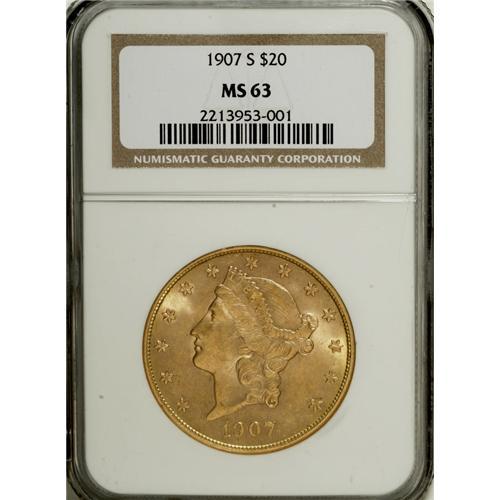 <B>1907-S $20 MS63 NGC.</B></I> Captivating rose-gold coloration adorns the shimmering, satiny surfaces. Boldly struck with a few grade-defining marks on each side. An attractive Select Mint State example from the final year of the Liberty Head double eagle series.<BR><BR><b>Shipping:</b> Coins & Currency (<a target="_blank" href="http://www.heritageauctions.com/common/shipping.php">view shipping information</a>)