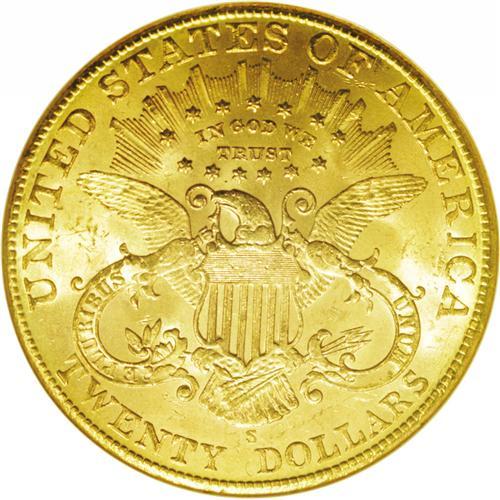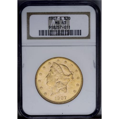 1907-S $20 MS63 NGC. Typically abraded for the grade,