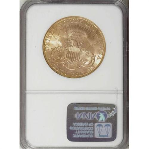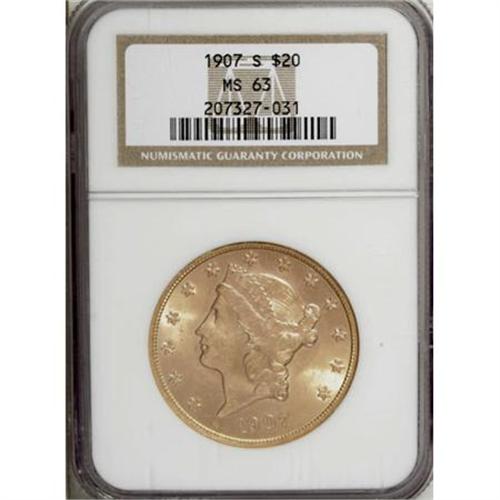 <B>1907-S $20 MS63 NGC.</B></I> A shimmering, well frosted example that is kept within the Select category by a series of facial marks. Popular final year of issue.<BR><BR><B>Coin Engraver:</B> James B. Longacre<BR><BR><b>Shipping:</b> Coins & Currency (<a target="_blank" href="http://www.heritageauctions.com/common/shipping.php">view shipping information</a>\)