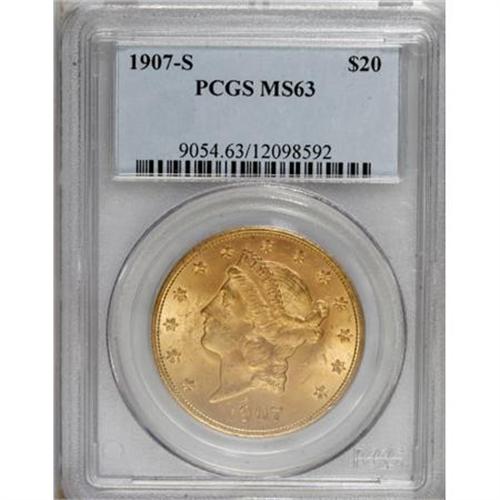 <B>1907-S $20 MS63 PCGS.</B></I> This khaki-gold example has coruscating luster and is only moderately abraded. The San Francisco Mint struck the Liberty types throughout 1907, unlike the Philadelphia Mint which eventually switched to the new Saint-Gaudens designs.<BR><BR><B>Coin Engraver:</B> James B. Longacre<BR><BR><b>Shipping:</b> Coins & Currency (<a target="_blank" href="http://www.heritageauctions.com/common/shipping.php">view shipping information</a>)