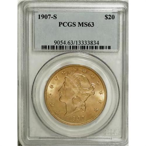 <B>1907-S $20 MS63 PCGS.</B></I> A pleasing mixture of orange-gold and rose toning appears over each side of this attractive example. Boldly struck with vibrant luster and typical surface marks for the grade. From the last year of the Liberty Head double eagle series.<BR><I>From The Parker Lee III Collection.</B></I><BR><BR><B>Coin Engraver:</B> James B. Longacre<BR><BR><b>Shipping:</b> Coins & Currency (<a target="_blank" href="http://www.heritageauctions.com/common/shipping.php">view shipping information</a>)