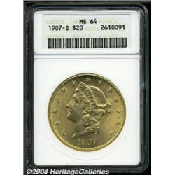 <B>1907-S<$20> MS64 ANACS.</B></I> This attractive Liberty Head double eagle enjoys pleasing satiny luster that is overlaid by even copper-gold color. The design elements are reasonably well struck, though a touch of softness can be observed on some of the highpoints. The surfaces of this specimen are relatively smooth and well preserved, with just a few unimportant ticks and luster grazes precluding a higher grade. <BR><BR><B>Important notice:</B> Heritage usually auctions material at the rate of 200-250 lots per hour. On some occasions eBay Live bid software or the Internet may not be able to keep up with the pace of the auction. We recommend placing a realistic absentee bid now as insurance to avoid disappointment. Occasionally the auctioneer may eliminate or reject an eBay Live bid, and the auctioneer may also reopen a lot after the close of the eBay live bidding (usually because we missed an audience bid), and may reject your bid even if it shows you as the winning bidder. By bidding via eBay Live, you agree that Heritage may award the lot to another bidder at its sole discretion under the circumstances described above or any other reasonable circumstances. Since eBay bids are not shown to us until we open the lot on the floor, we treat those bids just like floor bids. In most cases the floor responds before the eBay bid is presented to us, due to Internet lag time, so for consistency we have made it a policy that floor bids are always considered first over tie eBay live bids. Also please note that all Heritage lots purchased through eBay Live carry a 20% Buyer's Premium. Please make sure you read the Terms and Conditions before you bid. </span></font></tr></table></td></tr></table>