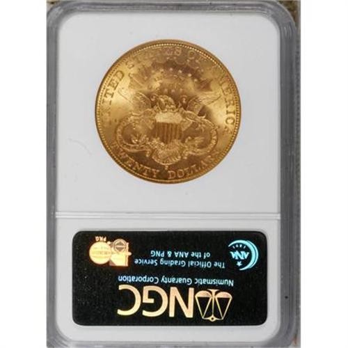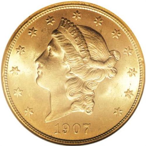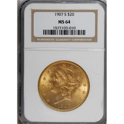 <B>1907-S $20 MS64 NGC.</B></I> An apricot-tinted Choice Liberty twenty from the final year of the long-running type. The strike is precise, and marks are individually inconsequential. The base of the 7 in the date is lightly repunched. As of (8/07), NGC and PCGS combined have certified just 13 pieces finer.<BR><BR><B>Coin Engraver:</B> James B. Longacre<BR><BR><b>Shipping:</b> Coins & Currency (<a target="_blank" href="http://www.heritageauctions.com/common/shipping.php">view shipping information</a>)