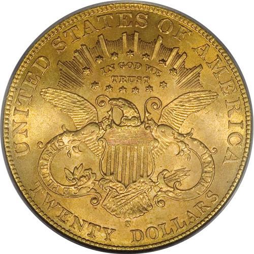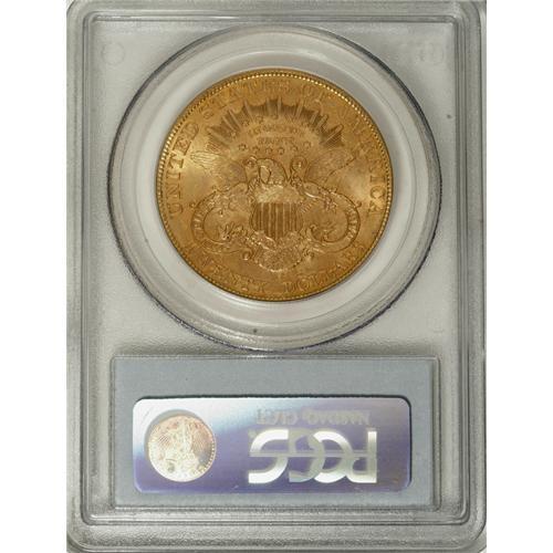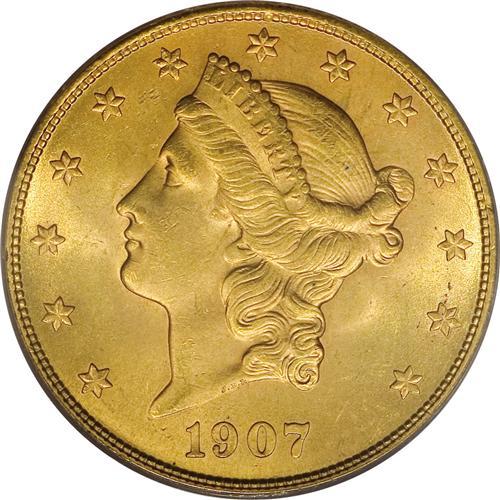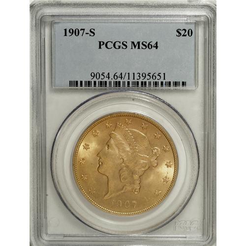 <B>1907-S $20 MS64 PCGS.</B></I> The 1907-S twenty is readily obtainable through MS63. The population dwindles significantly in near-Gem, and is rare any finer. This MS64 specimen displays glowing luster issuing from peach-gold and light tan surfaces that show blushes of orange on the reverse. Sharply struck design elements impart strong definition to the design elements. A handful of minute obverse marks define the grade, but are nowhere as plentiful or severe as usually found on this issue.<BR><BR><b>Shipping:</b> Coins & Currency (<a target="_blank" href="http://www.heritageauctions.com/common/shipping.php">view shipping information</a>) <BR><BR><B>Important