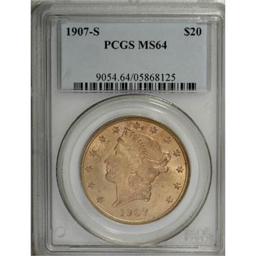<B>1907-S $20 MS64 PCGS.</B></I> The richly lustrous peach-gold and pink surfaces of this S-mint near-Gem offer a wonderful combination of satin and shine. Well struck with impressive eye appeal. PCGS has graded only two finer pieces (1/08).<BR><BR><B>Coin Engraver:</B> James B. Longacre<BR><BR><b>Shipping:</b> Coins & Currency (<a target="_blank" href="http://www.heritageauctions.com/common/shipping.php">view shipping information</a>)