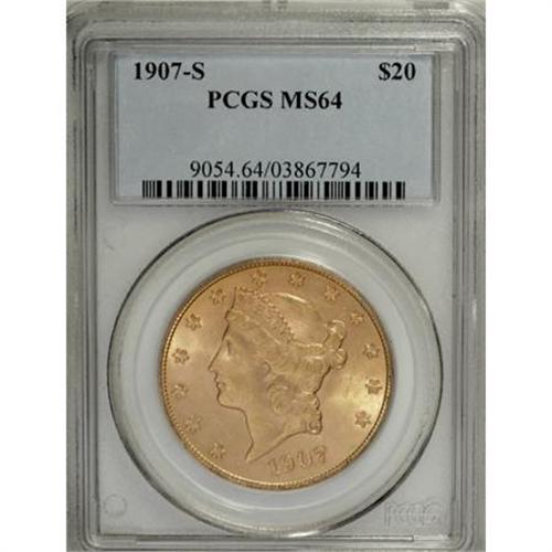 <B>1907-S $20 MS64 PCGS.</B></I> Cartwheel luster sweeps the apricot-gold fields and devices. The reverse is well preserved, and the obverse has only faint grazes on the cheek and left field. This suitably struck Choice double eagle is difficult to improve upon, since PCGS has encapsulated a mere two pieces finer (3/08).<BR><BR><B>Coin Engraver:</B> James B. Longacre<BR><BR><b>Shipping:</b> Coins & Currency (<a target="_blank" href="http://www.heritageauctions.com/common/shipping.php">view shipping information</a>)