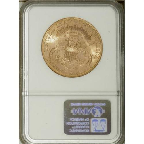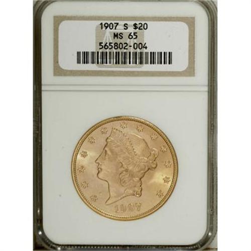 <B>1907-S $20 MS65 NGC.</B></I> Like so many Liberty double eagles, this date is not particularly hard to locate if one can control his or her desires and settle for an lower level Mint State coin. However, at the Gem grade level there are few offered, with many more collectors than coins available. This piece has extraordinary mint frosty with brilliant light yellow luster, accented by hints of faint pinkish color. All of the design elements are fully defined and the surfaces are essentially pristine and mark free. A single small chatter on the neck and another, even smaller, in the left obverse field are the only imperfections. Census: 11 in 65, 0 finer (6/07).<BR><BR><B>Coin Engraver:</B> James B. Longacre<BR><BR><b>Shipping:</b> Coins & Currency (<a target="_blank" href="http://www.heritageauctions.com/common/shipping.php">view shipping information</a>\)