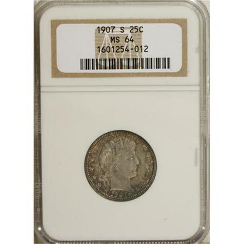 <B>1907-S 25C MS64 NGC.</B></I> NGC Census: (8/11). PCGS Population (13/17). Mintage: 1,360,000. Numismedia Wsl. Price for NGC/PCGS coin in MS64: $1,475. (#5648)<BR><BR><B>Coin Engraver:</B> Charles E. Barber<BR><BR><b>Shipping:</b> Coins & Currency (<a target="_blank" href="http://www.heritageauctions.com/common/shipping.php">view shipping information</a>\)