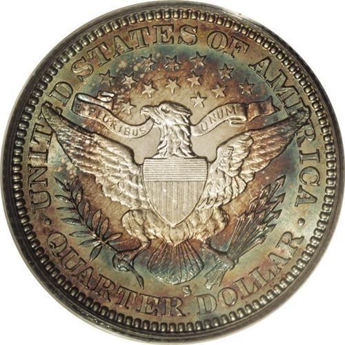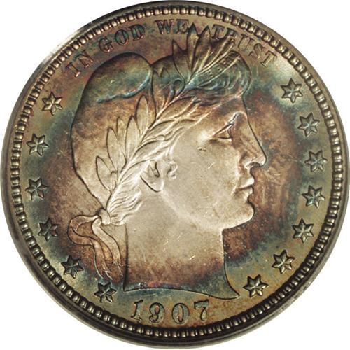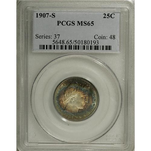 <B>1907-S 25C MS65 PCGS.</B></I> This is a conditionally scarce issue that is difficult to find in problem-free AU preservation, let alone as a Gem. Vivid target toning adheres to both sides with swirls of turquoise-blue, crimson, and antique-gold colors toward the borders. The strike is essentially full and the lack of most distracting abrasions is consistent with the grade. Population: 9 in 65, 8 finer (12/06).<BR><BR><b>Shipping:</b> Coin/Currency (<a target="_blank" href="http://www.heritageauctions.com/common/shipping.php">view shipping information</a>)