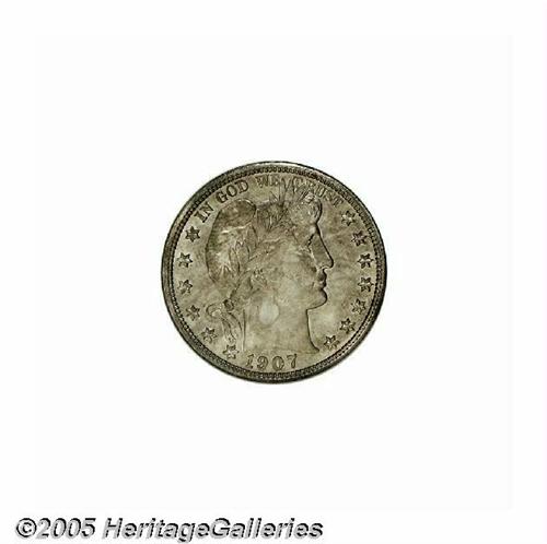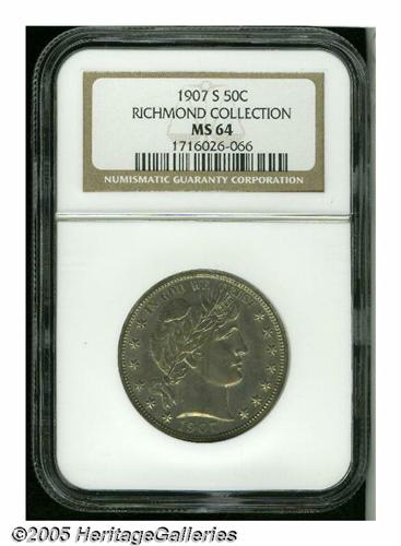 <B>1907-S<50C> MS64 NGC.</B></I> Ex: Richmond Collection. One of the unsung rarities in the Barber Half Dollar series in Mint State. This Choice, moderately toned near-Gem displays a typical strike and offers full, frosty luster just under the patina. There are a few contact marks on Liberty's cheek and neck, while the reverse seems blemish-free. Population: 5 in 64, 8 finer (6/05).