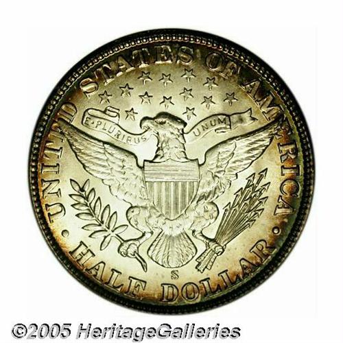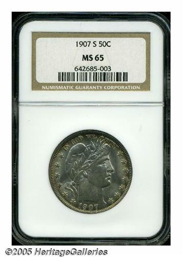 <B>1907-S<50C> MS65 NGC.</B></I> The 1907-S is one of the true unsung rarities in the Barber Half Dollar series in Mint State and its difficulty only compounds at the Gem level. This remarkably preserved example is very well struck, with a radiant, satiny sheen and lovely golden-russet peripheral toning. Population: 4 in 65, 3 finer (5/05).