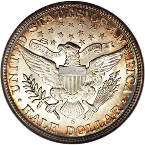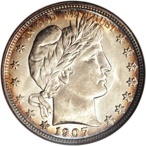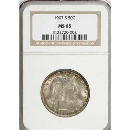 <B>1907-S 50C MS65 NGC.</B></I> The 1907-S is a legendary issue among knowledgeable Barber half aficionados, as it is well known to be among the most elusive of the series in the higher Mint State grades. The Feigenbaums rank it among the scarcest late dates in the series, at R.5 in Mint State. This example demonstrates the good criteria the issue is known for. The silvery centers complement iridescent amber-gold and ice-blue at the rims, with a bold strike (but not quite full) and enormous eye appeal. Expect fierce bidding on this lovely Gem.<BR><I>From The Southwest Collection.</B></I><BR><BR><B>Coin Engraver:</B> Charles E. Barber<BR><BR><b>Shipping:</b> Coins & Currency (<a target="_blank" href="http://www.heritageauctions.com/common/shipping.php">view shipping information</a>)