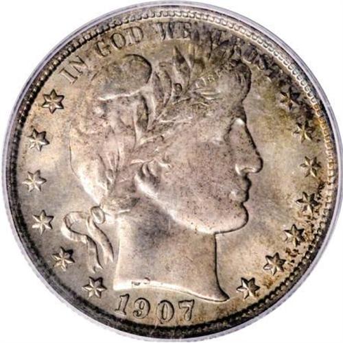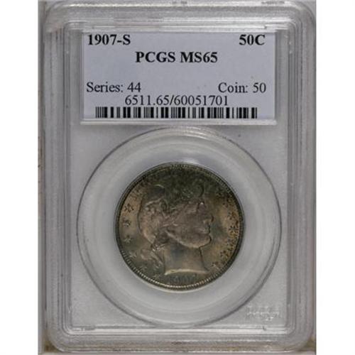 <B>1907-S 50C MS65 PCGS.</B></I> David Lawrence, in his <I>The Complete Guide to Barber Halves</B></I>, writes that the 1907-S is "... the scarcest late date of the series in Mint State," and rates the issue in this condition as R.5. Glowing luster emanates from each side of this gorgeous Gem. A coat of low intensity gold-beige and bluish-gray patination enriches well cared for surfaces that reveal just a few minor marks that are well within the confines of the grade designation. The design detail is generally sharp, except for minor weakness in the upper right corner of the shield and adjacent feathers. Population: 7 in 65, 7 finer (7/07).<BR><BR><B>Coin Engraver:</B> Charles E. Barber<BR><BR><b>Shipping:</b> Coins & Currency (<a target="_blank" href="http://www.heritageauctions.com/common/shipping.php">view shipping information</a>\)