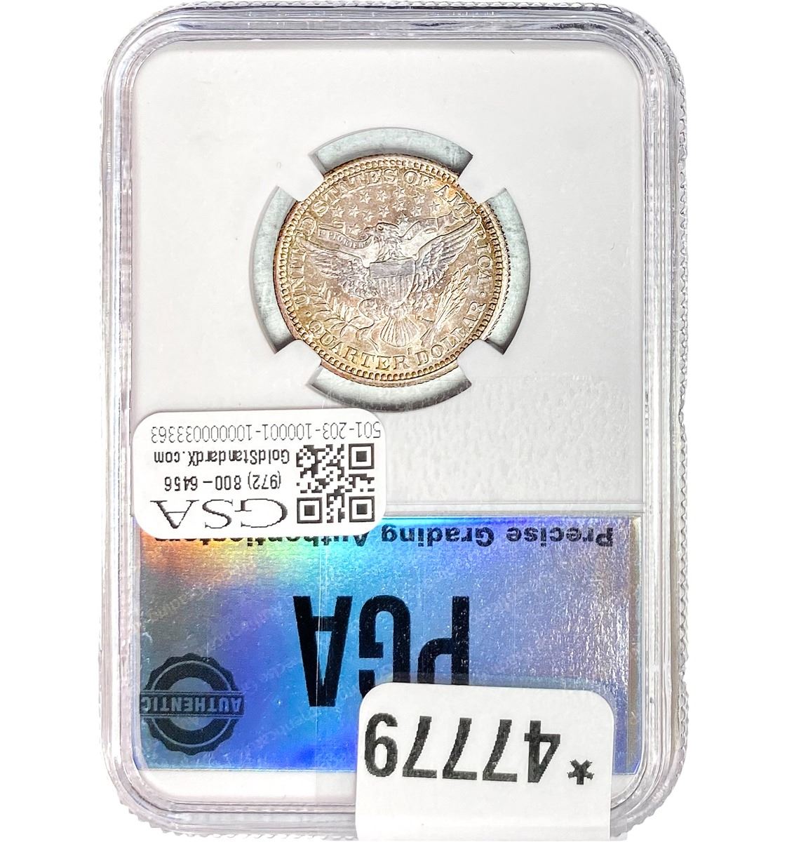 e. Coins sold referencing a third-party grading service are sold “AS IS” without any express or implied warranty, except for a guarantee by GSA that they are genuine. Removal or alteration of the holder, voids all of Bidder’s claims concerning that Product. Certain warranties may be available from the grading services and Bidders are referred to them for further details: Numismatic Guaranty Corporation (NGC), PO Box 4776, Sarasota, FL 34230, www.ngccoin.com/services/writtenguarantee.asp; Professional Coin Grading Services (PCGS), PO Box 9458, Newport Beach, CA 92658, www.pcgs.com/guarantee.html; ANACS, 6555 S. Kenton St., Ste. 303, Englewood, CO 80111; and Independent Coin Grading Co. (ICG), 7901 East Bellview, Ave., Suite 50, Englewood, CO 80111.