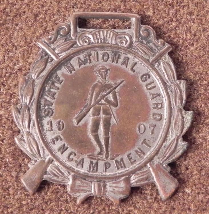 1907 STATE NATIONAL GUARD ENCAMPMENT-US SOLDIER AND CROSSED RIFLES MEDAL/FOB
