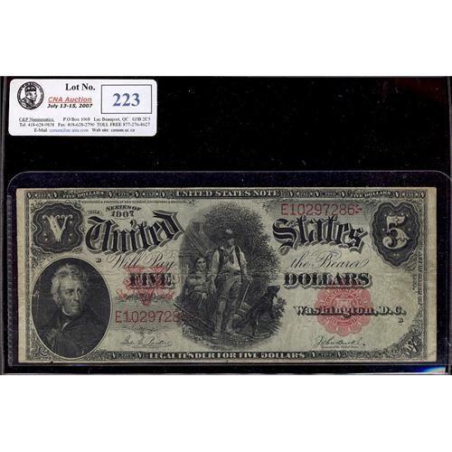 1907 US $5 . Note grades F/VF with some minor pinholes.