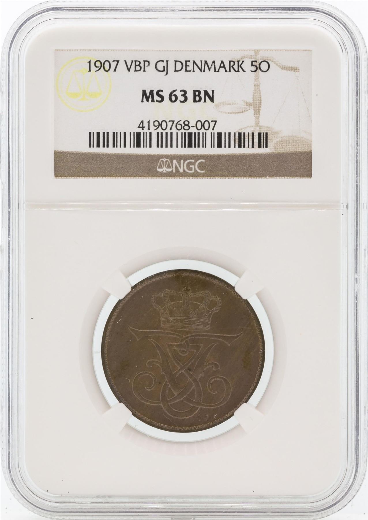 One 1907 VBP GJ Denmark 5 Ore Bronze Coin NGC MS63 BN.