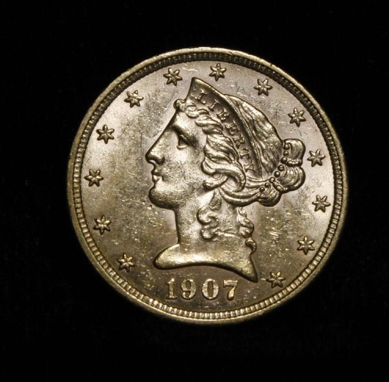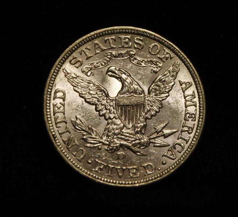 Nice uncirculated example of the $5 Half Eagle. The Wholesale Greysheet lists ms62 at $650. Estimated Value $650